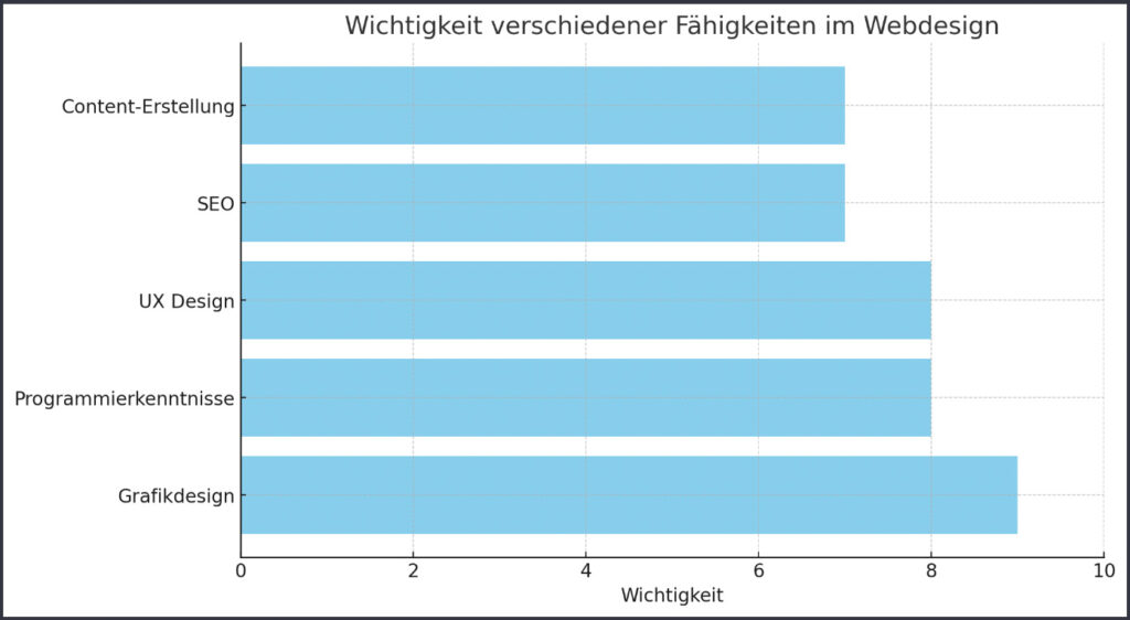 In dieser Visualisierung siehst du die Wichtigkeit verschiedener Fähigkeiten im Bereich Webdesign. Grafikdesign sticht als besonders bedeutend hervor, dicht gefolgt von Programmierkenntnissen und User Experience Design. Suchmaschinenoptimierung (SEO) und Content-Erstellung sind ebenfalls wichtig, aber in etwas geringerem Maße. Diese Darstellung hilft dabei, die Prioritäten für angehende Webdesigner zu setzen.